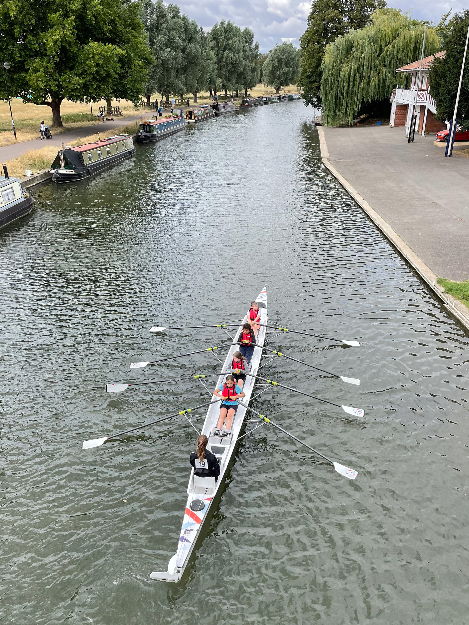 Finally, it was time to get out on the water and put everything learned so far into practice. Life jackets on, with a mixture of nerves and excitement, the children stepped into the boats and pushed off. Like ducks to water, after a few practices outside the boathouses, the crews were ready to try ‘bridge to bridge’ regatta style racing. Ready, set… go!